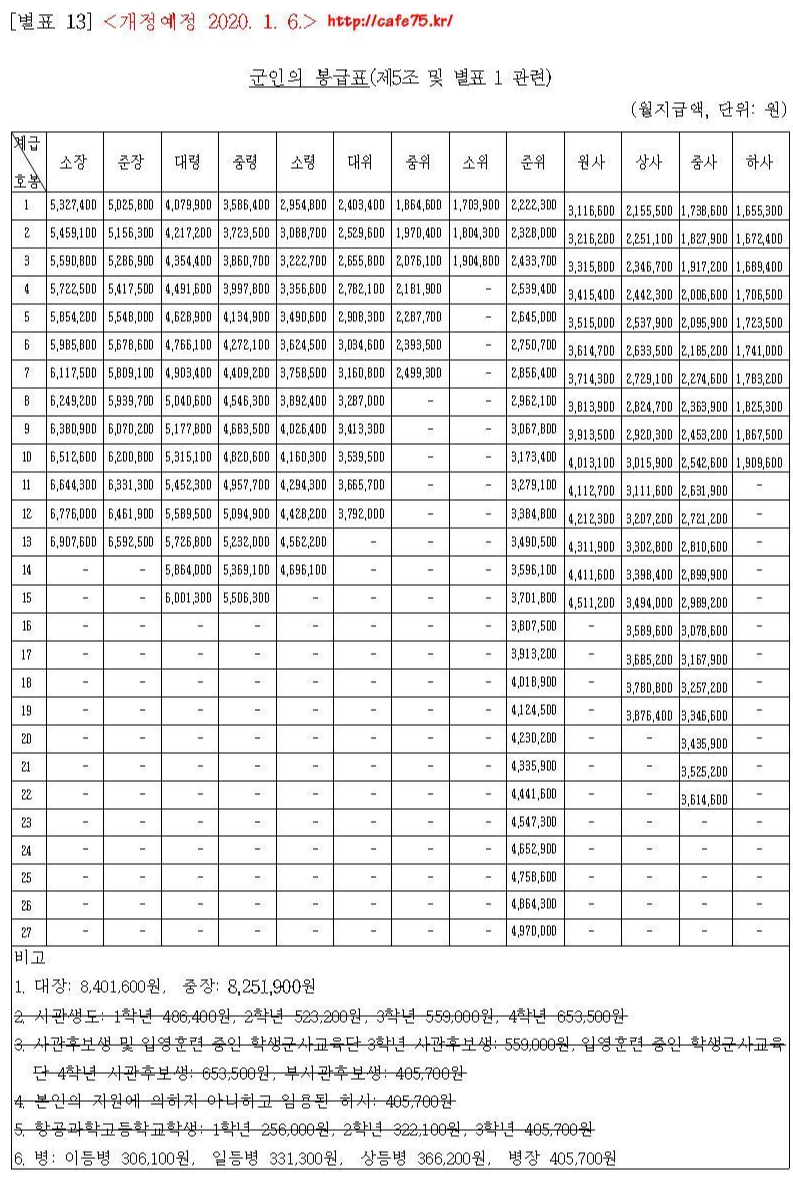 군인, 교사, 공안직 공무원 봉급표 등은