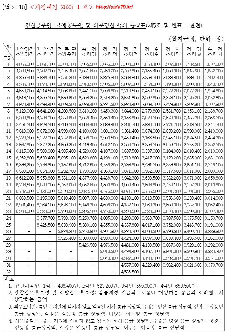 2020 소방공무원 봉급표 2020 경찰공무원 봉급표