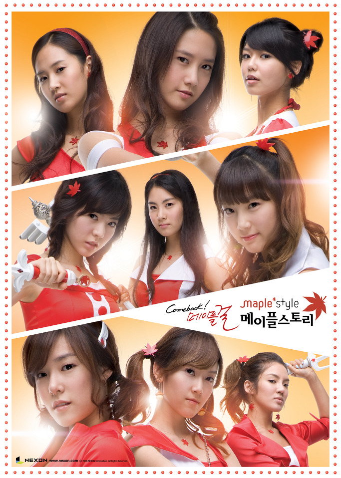 넥슨의 온라인게임 메이플스토리가 나쁜 게임은 아니지만 데뷔한 지 얼마 안 되었을 때의 순진한 소녀시대들을 메이플걸로 코스프레를 시키다니... 대단한 메이플스토리야~