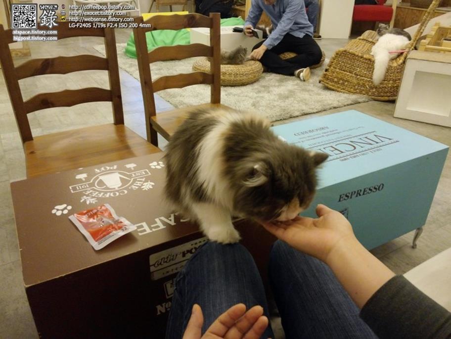 가족들이 집에서 고양이를 분양받아서 키울 수 없으니, 고양이를 만지고 싶으면 카페를 선호하는데 집 근처인 목동에 고양이까페인 "커피파는 고양이"가 있음에도 불구하고, 훨씬 더 귀엽고 이쁘고 깔끔하게 관리된 고양이가 있는 잠실 석촌호수 옆에 있는 송파동의 고양이카페인 고양이랑까지 굳이 가고 싶어한다. 쉬는 날 차라리 부산까지 운전하라면 하겠는데, 매일 출퇴근하는 것도 귀찮은 회사 근처까지 떠밀리듯 와야만 하지만 일단 고양이 카페에 들어서면 그딴 투정따윈 눈녹듯 사라진다.
