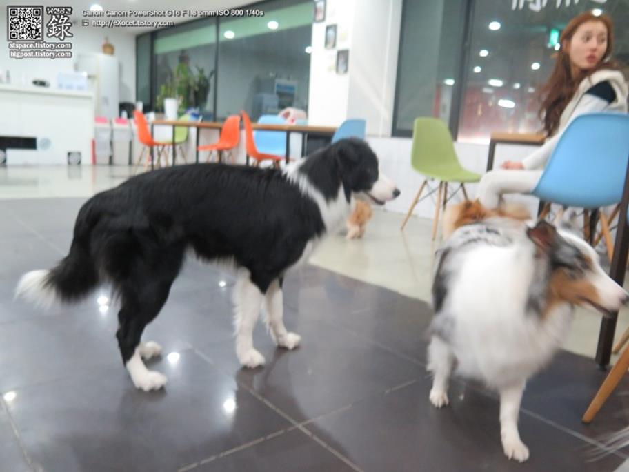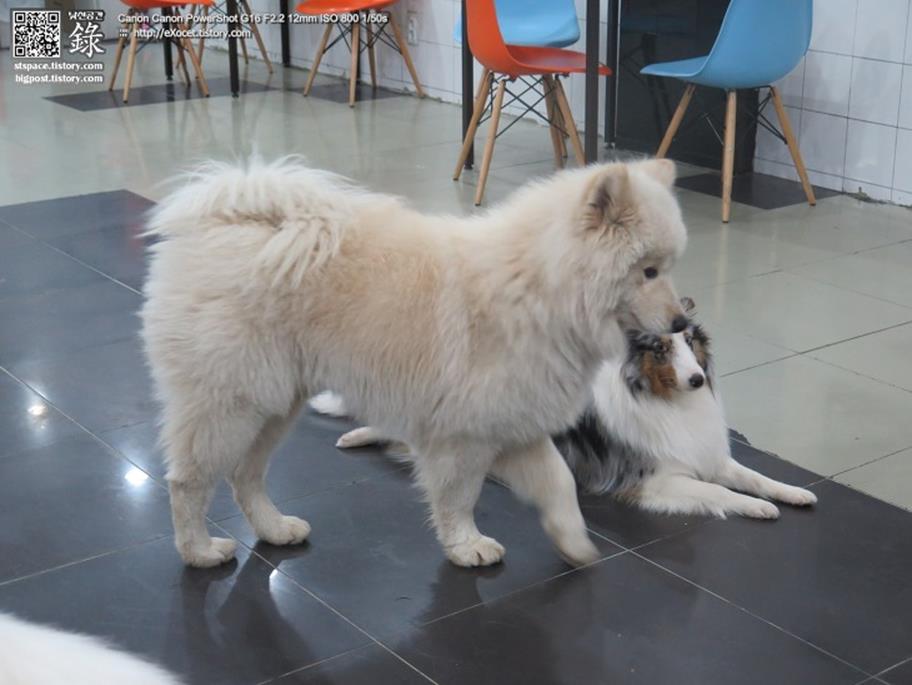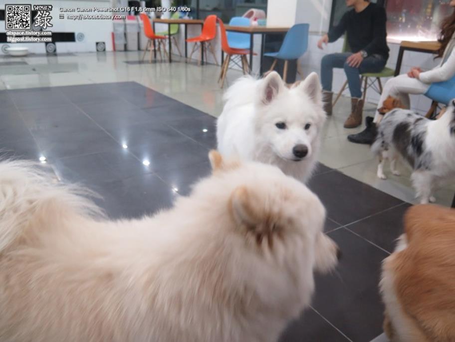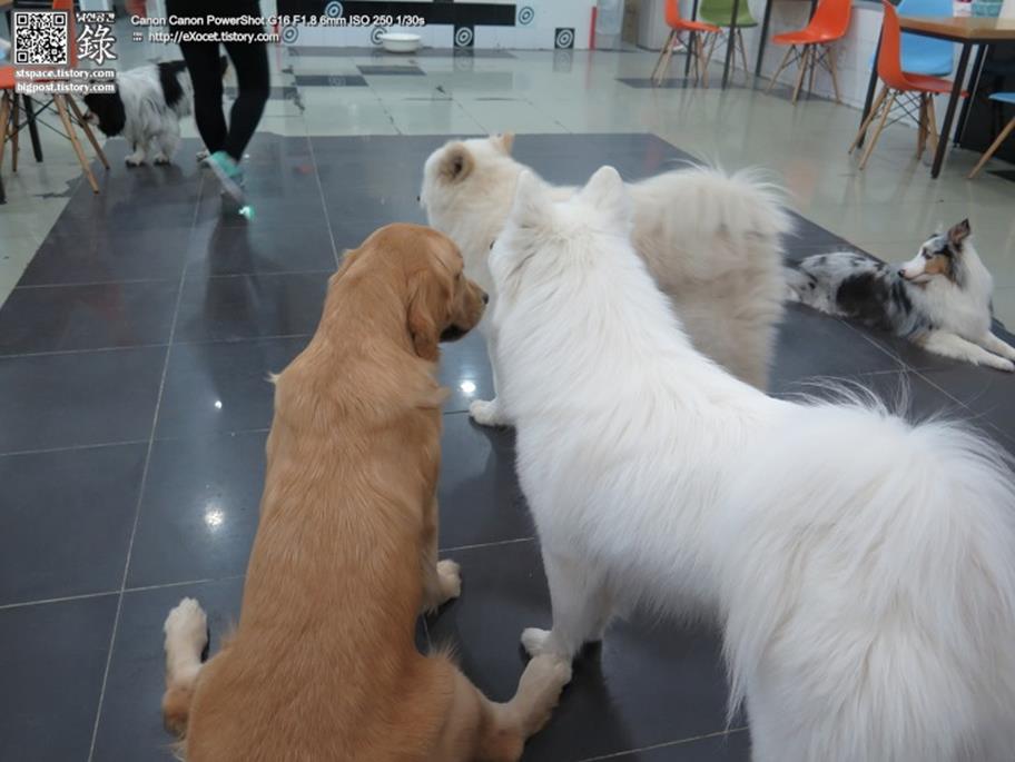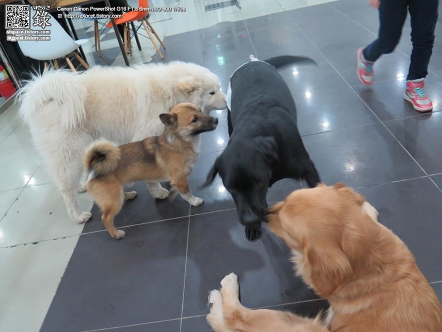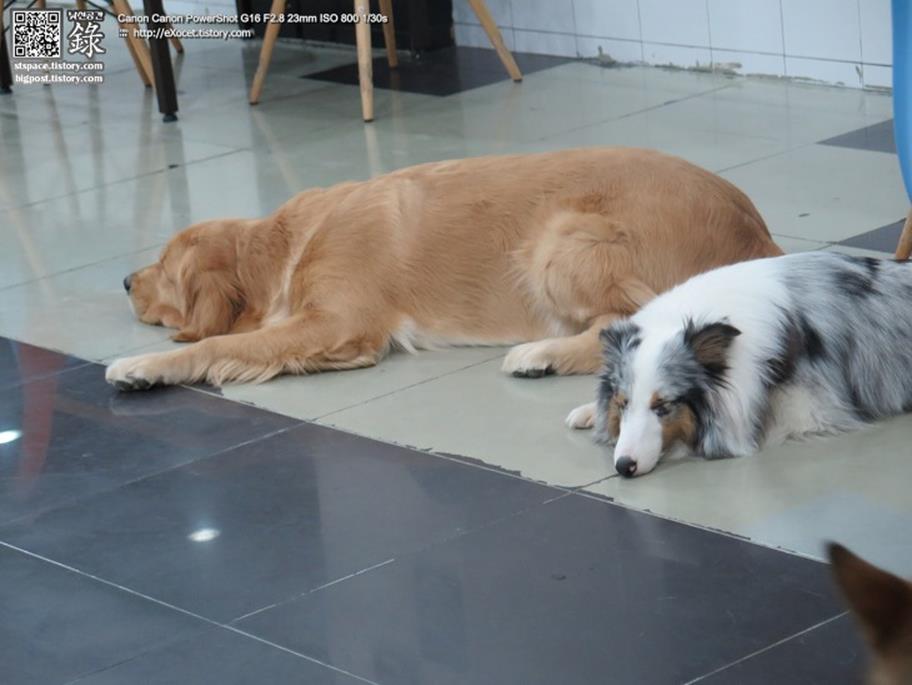 게다가 소형견들도 아니고, 골든 레트리버부터 시작해서 사모예드 두 마리(얘들은 아마손님인 듯), 셔플 랜드 쉽독, 보더 콜리, 웰시 코기 등등 테이블은 6개 정도만 있고, 나머지 공간이 넓어서 저 녀석들이 우당탕탕 뛰어다녀도 될 정도로 넓다는.