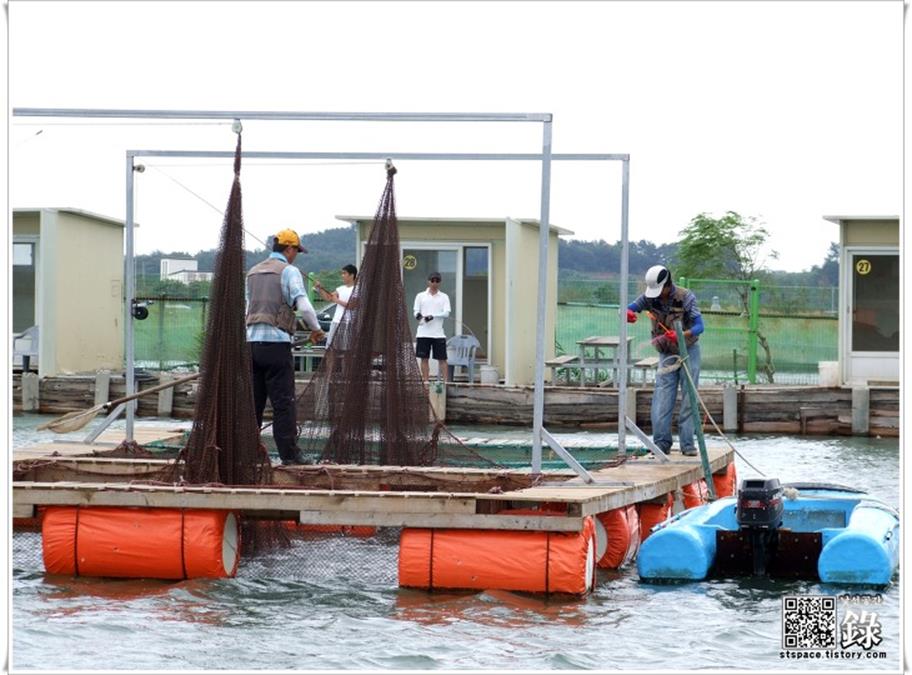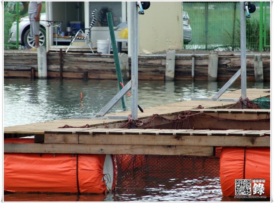 가두리 우측에 앉은 우리는 가두리 넘어서 건너편 방갈로 앞까지 찌를 장타를 날린 뒤에 살살 끌어당겨줌으로써, 찌가 가두리 쪽으로 흘러가게 한 다음 살살 끌어들이는 방법을 사용했습니다.