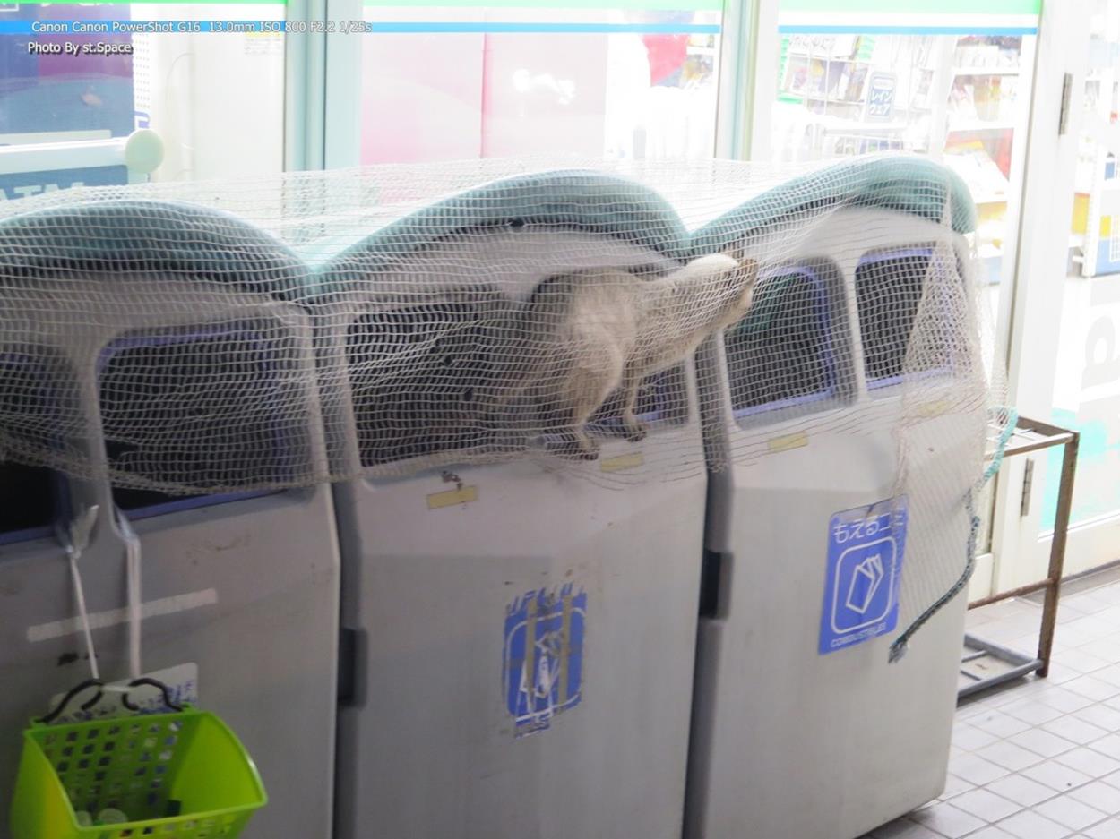편의점 투어를 마치고 나왔더니, 편의점 쓰레기통에 저렇게 그물이 쳐져 있다.
