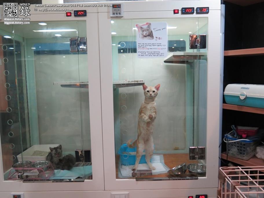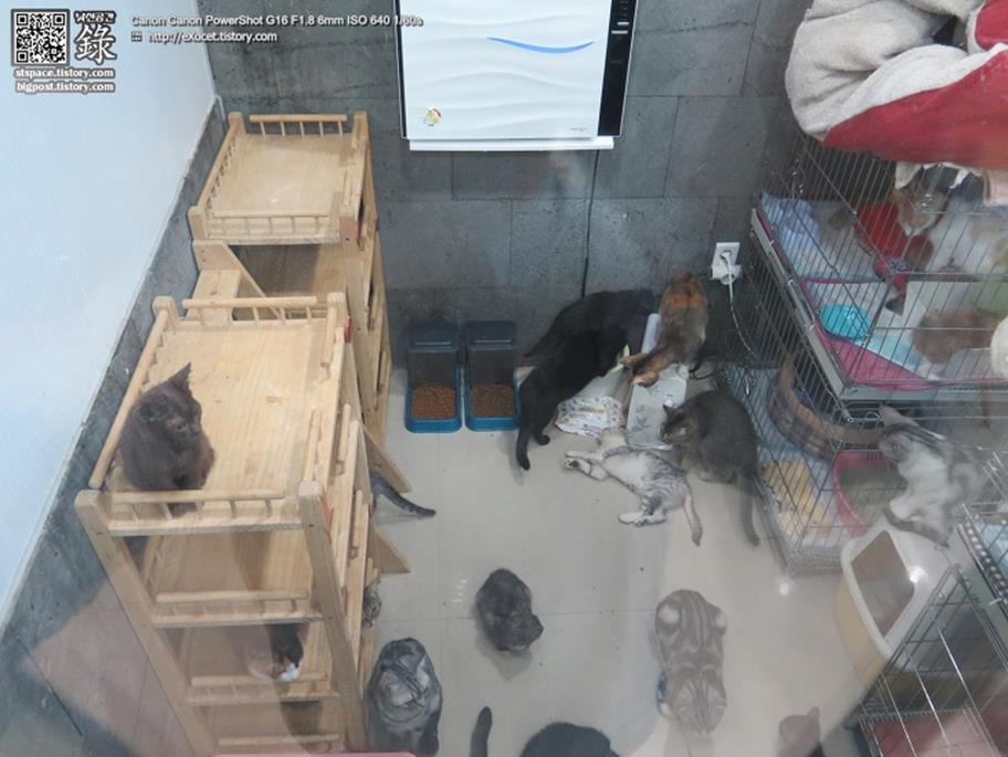 송파동의 고양이랑 카페는 먼치킨들이 많고 고양이들의 관리가 잘되어 있던 반면에 목동의 커피 파는 고양이 카페의 고양이들은 자유분방한 대신 애꾸도 있고, 눈곱이 잔뜩 낀 녀석도 있고 눈병에 걸린 녀석도 있다. 고양이는 백 마리쯤 될 듯 엄청 많다. 아기방에 아직 포육 중인 아기 냥이들도 있다.