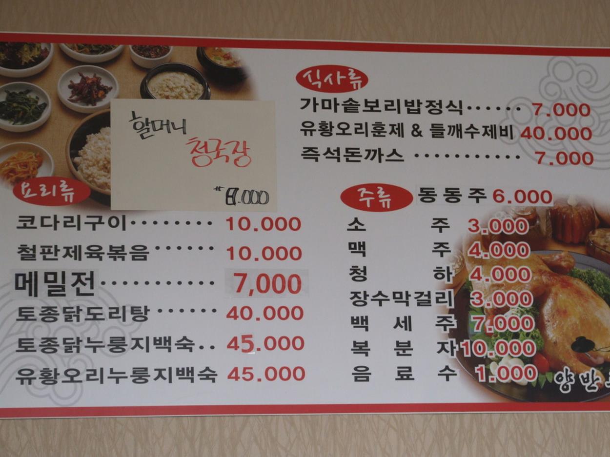 양반촌의 할머니 청국장은 가격이 참 들죽날죽한 메뉸데요...