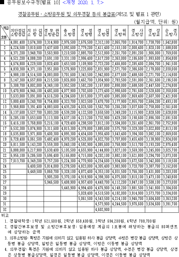 2020 소방공무원 봉급표 2020 경찰공무원 봉급표