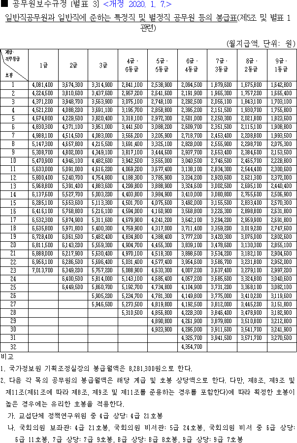 군인, 교사, 공안직 공무원 봉급표 등은