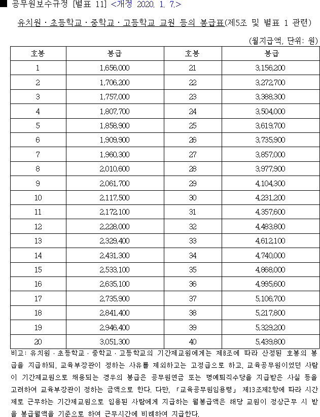 2020 교원 봉급표 2020 교사 월급