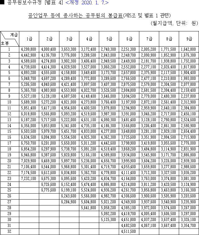 2020년 공안직 공무원 봉급표
