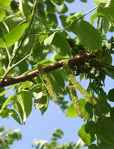 호두나무꽃: 낙엽활엽교목 원산지: 중국 이명: 추자나무 20m까지 자라며, 익히 잘 아는 호두가 열리는 나무임. 암수꽃이 한 나무에서 피는 일가화로 4~5월에 개화. 9~10월에 성숙, 열매는 둥글고 털이 없으며, 핵은 거꾸로 세운 달걀 모양임. 열매는 식용 및 약용으로 쓰이며, 나무 껍질에서 타닌을 채취함. 열매는 단백질이 풍부한 고급 식품으로 수익성이 높은 경제조림수종. 수꽃은 길게 늘어지는 꽃을 피우며, 밤꽃하고 혼동하기 쉬우나, 밤꽃은 좀더 하얀 색을 띄며, 호두나무의 나뭇잎은 밤나무 잎에 비해 상대적으로 짧고, 부드러우며, 광택이 덜함. 풍매화(수분이 꽃가루를 바람에 날려 이룸) 위는 수꽃 아래는 암꽃(출처 네이버 카페:훈련교수회)